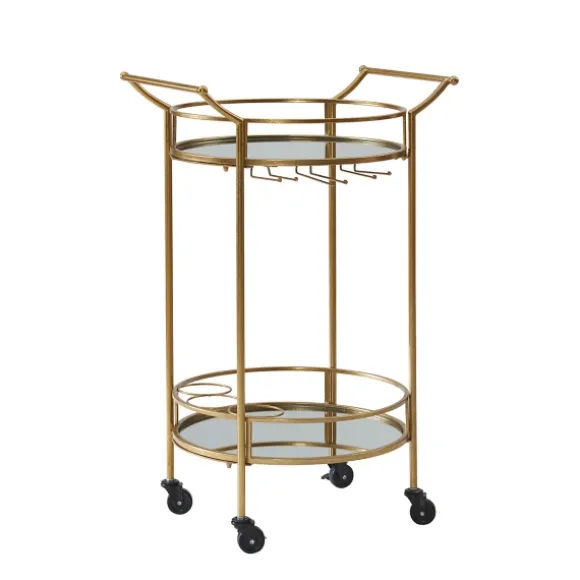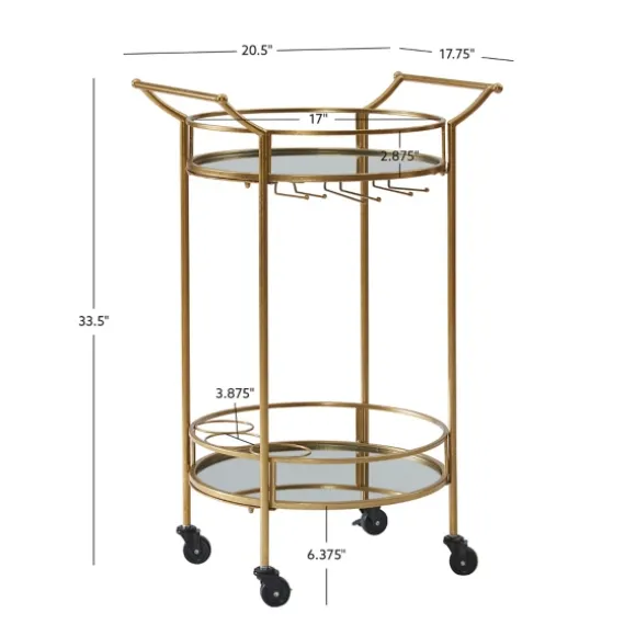 Our Gold Metal Frame Bar Cart With Mirrored Shelves Makes Creating Cocktails A Special Event! With Built-In Wine Bottle And Glass Holders, This Elegant Piece Is A Must-Have For Party Hosts. Bar Cart Measures 20.5L X 17.75W X 33.5H In.Crafted Of Metalgold Leaf Metal Frame Finishfeatures Two (2) Mirrored Shelvestop Shelf Features Three (3) Wine Glass Holdersbottom Shelf Features Three (3) Wine Bottle Holdersaccented With Two (2) Handles For Easy Transportincludes Four Functioning Wheels On Baseweight Capacity: 15 Lbs. Per Shelfassembly Requirednot Intended For Commercial Usecare: Dust With A Soft, Dry Cloth.This Item Is Available At Kirklands.Com Only, Not Available In Stores. Please Note: This Item Cannot Be Shipped To Apo/Fpo Addresses.Warning:This Product Can Expose You To Chemicals Including Di-(2-Ethl Hexyl) Phthalate Which Is Known To The State Of California To Cause Cancer And Birth Defects Or Other Reproductive Harm.For More Information Go Towww.P65Warnings.Ca.Gov .
