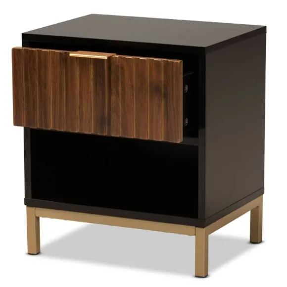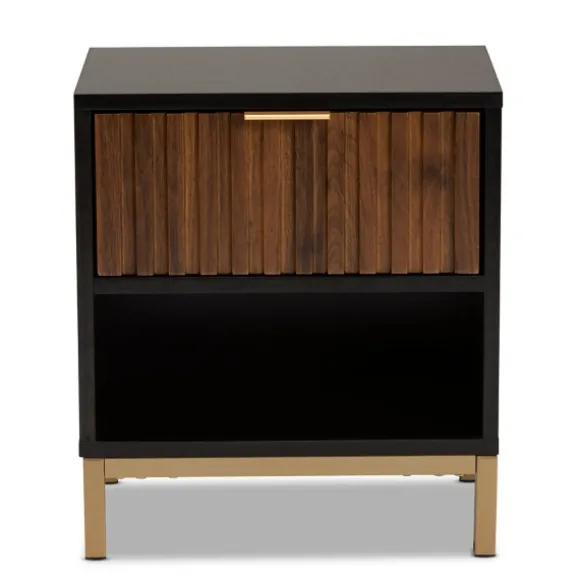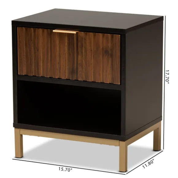 Add Some Stylish Extra Storage To Your Bedroom With This Black And Brown Single Drawer Nightstand. With Its Modern Style, It’S Sure Give Your Space A Fresh Look! You’Ll Love The Convenience Of Having It Next Your Your Bed! Nightstand Measures 15.7L X 11.8W X 17.7H In.Crafted Of Wood Composite And Metalblack Frame Finishfeatures One (1) Drawer And One (1) Lower Shelfbrown Drawer Finishgold Metal Legsassembly Requirednot Intended For Commercial Usecare: Dust With A Soft, Dry Cloth.This Item Is Available At Kirklands.Com Only, Not Available In Stores. Please Note: This Item Cannot Be Shipped To Apo/Fpo Addresses.