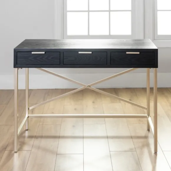 Make Your In-Home Office Space Look Smart And Chic With The Help Of This Black And Gold Blake Desk! You’Re Sure To Love The Dark Finish And Metallic Details. Desk Measures 44L X 20W X 32H In.Crafted Of Wood Composite And Metalblack Finish With Light Gold Hardwareincludes Three (3) Drawersweight Capacity: 100 Lbs.Some Assembly Requirednot Intended For Commercial Usecare: Wipe With A Soft, Damp Cloth.Contact Your Local Kirkland’S Store For Availability. Quantities And Selection May Vary By Location.