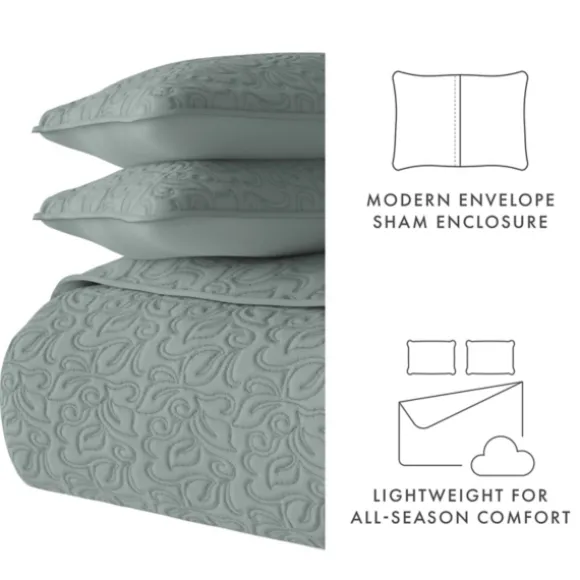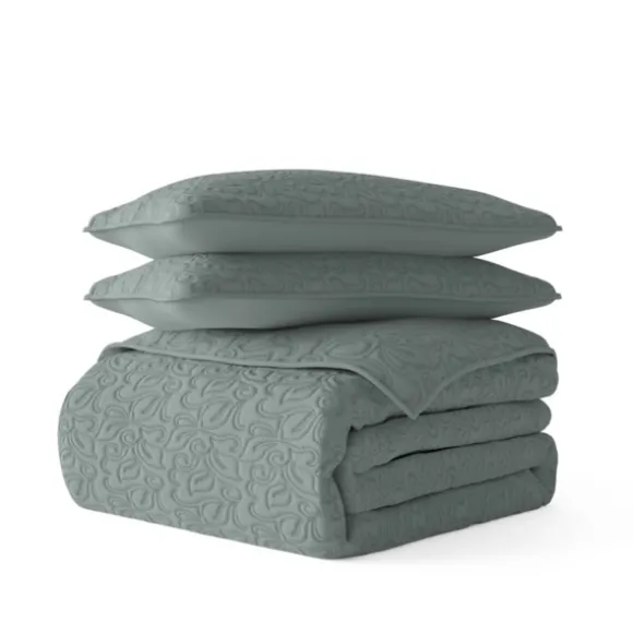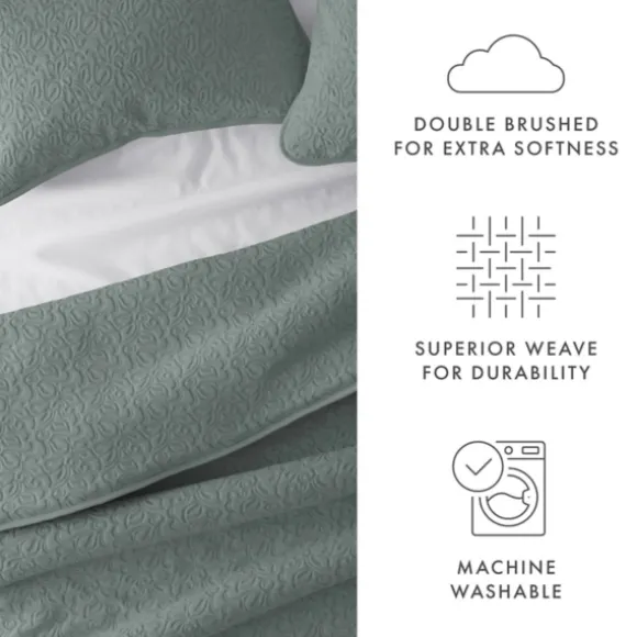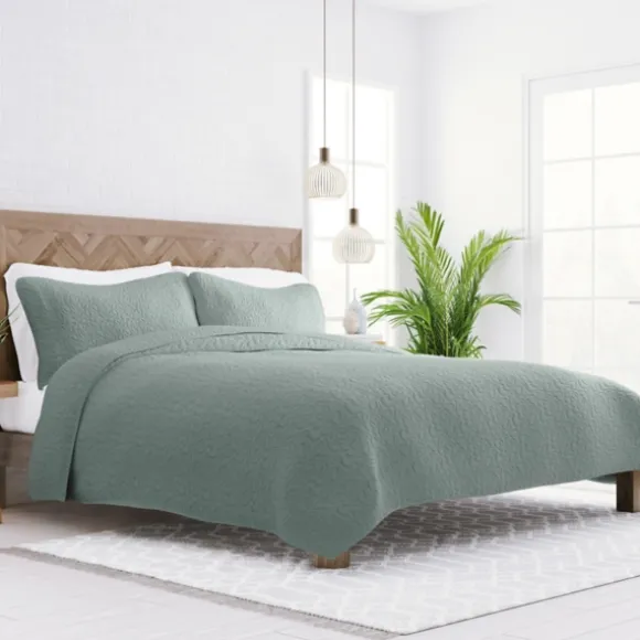 Dress Up Your Bed With Understated Elegance Using This Green Stitched Floral 3-Pc. King Quilt Set. Made With A Microfibe…