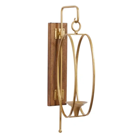 Our Modern Warm Wood And Gold Sconce Is A Beautiful Combination Of Both Natural And Elegant Elements! You’Ll Love The Way This Angular Piece Looks Hanging In Your Foyer. Sconce Measures 7.8L X 6W X 24.1H In.Handcrafted Of Solid Wood And Metalwarm Brown Finish With Gold Accentsfeatures A Modern, Oval Frame Designaccommodates One (1) Pillar Candle; Not Includedhangs From Back-Mounted Hardwareweight: 2.6 Lbs.Care: Dust With A Soft, Dry Cloth. Not Suggested For Outdoor Use.This Item Is Available At Kirklands.Com Only, Not Available In Stores. Please Note: This Item Cannot Be Shipped To Apo/Fpo Addresses.Warning:Cancer And Reproductive Harm – For More Information Go Towww.P65Warnings.Ca.Gov .
