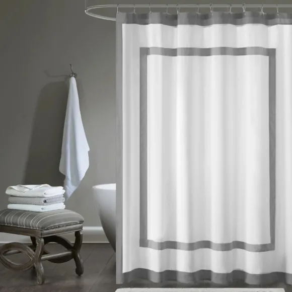 Kirkland’s Home Shower Curtains-Gray Square Trim Cotton Shower Curtain