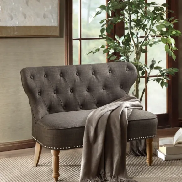 Bring Some Luxury To Your Home With Our Charcoal Tufted Upholstered Settee. You’Ll Love The Classic Design And Delicate Detailing Of This Comfortable Seat. Settee Measures 44L X 27W X 32.25H In.; Seat Measures 17.5H In.Crafted With A Wood And Wood Composite Frametan Leg Finishupholstered In Gray 100% Polyester Fabric With Foam Fillfeatures Button Tufting And Nail Head Detailingweight: 52.74 Lbs.Weight Capacity: 600 Lbs.Some Assembly Requirednot Intended For Commercial Usecare: Spot Clean Only.This Item Is Available At Kirklands.Com Only, Not Available In Stores. Please Note: This Item Cannot Be Shipped To Apo/Fpo Addresses.