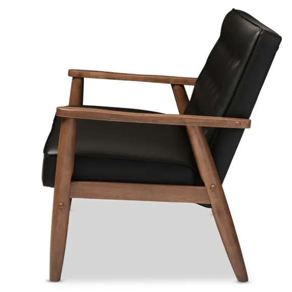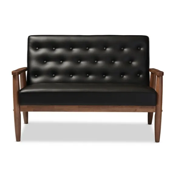Our Black Faux Leather Modern 2-Seat Loveseat Is The Perfect Addition To Your Home. You’Ll Love The Sleek Wooden Frame And Stunning Button Tufted Detailing Of This Comfortable Loveseat. Loveseat Measures 48.95L X 29.45W X 32.96H In.; Seat Height Measures 17.16H In. Crafted With A Rubberwood Frame Upholstered In Black Faux Leather Fabric Dark Walnut Wood Finish Mid-Century Design Features Removable Cushions With Stoppers Underneath Seat Cushion Features Button-Tufting And Piping Detailing Features Rounded Armrests And Splayed Legs Weight: 50.6 Lbs. Assembly Required Weight Capacity: 410 Lbs. Not Intended For Commercial Use Care: Spot Clean Only.This Item Is Available At Kirklands.Com Only, Not Available In Stores. Please Note: This Item Cannot Be Shipped To Apo/Fpo Addresses. Warning:Cancer And Reproductive Harm – For More Information Go Towww.P65Warnings.Ca.Gov .