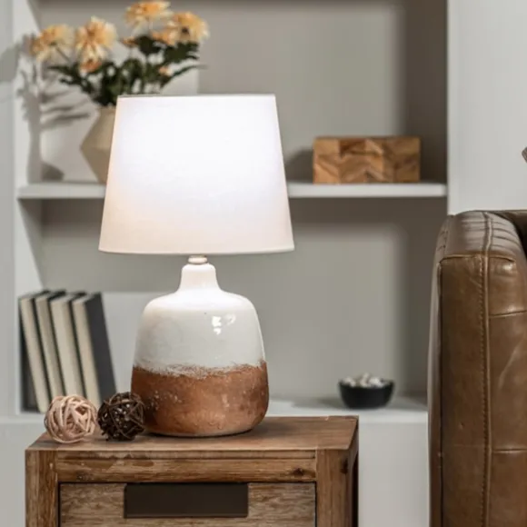 Light Up Your Life With This White And Bronze Ceramic Table Lamp. With Its Two-Toned Finish, It Will Bring A Refreshing Touch To Any Room Of Your Home! Lamp Measures 17.5H In.Crafted Of Ceramictwo-Toned White And Bronze Finishround Basesoftback Tapered Drum Shade In White Linen Fabricshade Measures 8H X 10 In. In Diametersocket Accommodates A 9-Watt, Type-A Led Bulbfeatures A 72 In. Plug-In Cordcare: Dust With A Soft, Dry Cloth. Do Not Exceed Specified Wattage.This Item Is Available At Kirklands.Com Only, Not Available In Stores. Please Note: This Item Cannot Be Shipped To Apo/Fpo Addresses.