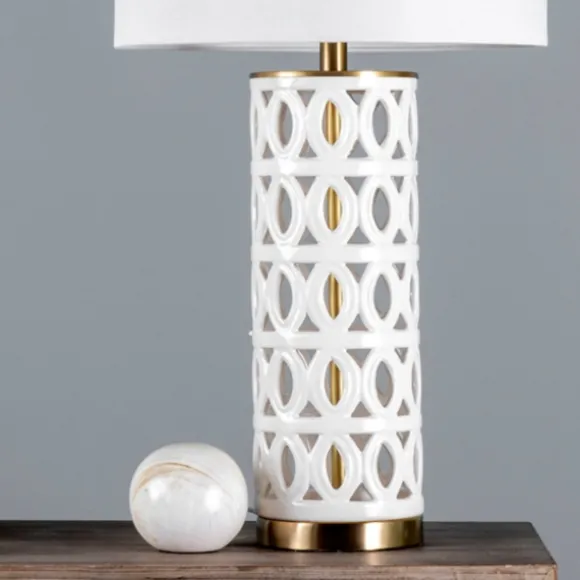 Our White And Gold Cut-Out Ovals Table Lamp Is The Perfect Combination Of Airy And Modern! You’Ll Love The Way The Soft Edges And Metallic Accents Light Up Your Living Room Decor. Lamp Measures 29H In.Crafted Of Ceramic And Metalwhite Finish With Gold Accentsfeatures A Cylinder Shaped Bodice With Cut-Out Ovalssoftback Drum Shade In White Fabricshade Measures 10.3H X 15 In. In Diametersocket Accommodates A 100-Watt Bulbfeatures A 72-In. Plug-In Cordcare: Dust With A Soft, Dry Cloth. Do Not Exceed Specified Wattage.This Item Is Available At Kirklands.Com Only, Not Available In Stores. Please Note: This Item Cannot Be Shipped To Apo/Fpo Addresses.