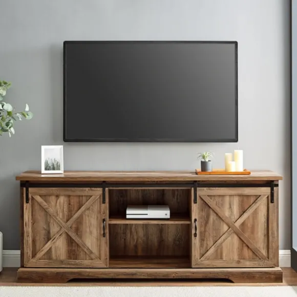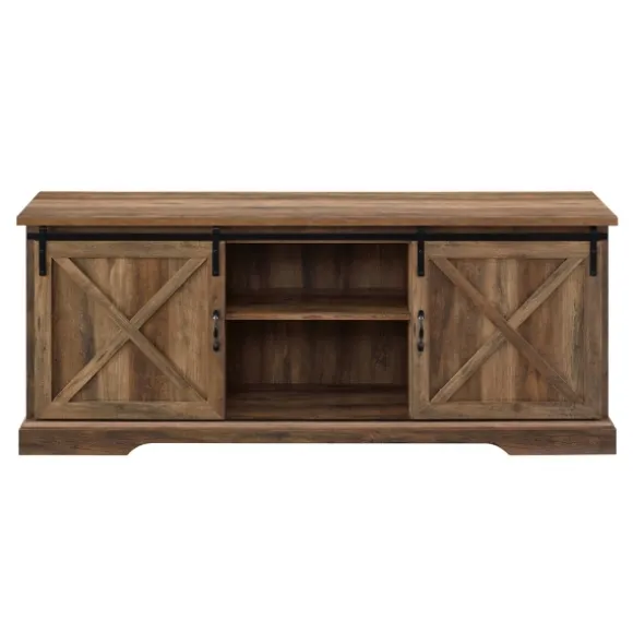 Update Your Living Space With Our Rustic Oak Sliding Barn Door Tv Stand! This Rustic Stand Is Perfect For Organizing All Your Books, Games, And Consoles.Stand Measures 70L X 15.75W X 28H In. Crafted Of Warp-Resistant Wood Composite, Durable Laminate, And Powder-Coated Steel Brown Finish Features Two (2) Open Shelves And Two (2) Sliding Barn Doors For Storage And Cord Management Black Metal Hardware Sliding Doors Reveal One (1) Large Middle Section And Two (2) Small Side Sections Each With Adjustable Shelves Can Support A 85-Inch Tv Weight: 104 Lbs. Full Assembly Required Not Intended For Commercial Use Care: Wipe Clean With A Damp Cloth. This Item Is Available At Kirklands.Com Only, Not Available In Stores. Please Note: This Item Cannot Be Shipped To Apo/Fpo Addresses. Warning:This Product Can Expose You To Chemicals Including Dust And Phthalates Which Is Known To The State Of California To Cause Cancer And Birth Defects Or Other Reproductive Harm. For More Information Go Towww.P65Warnings.Ca.Gov .