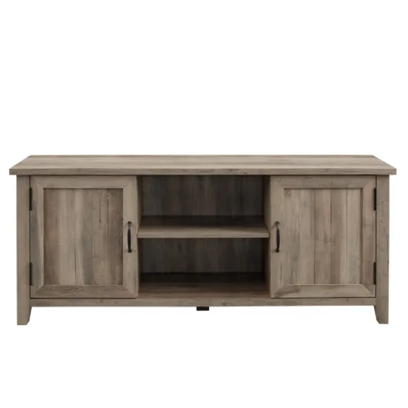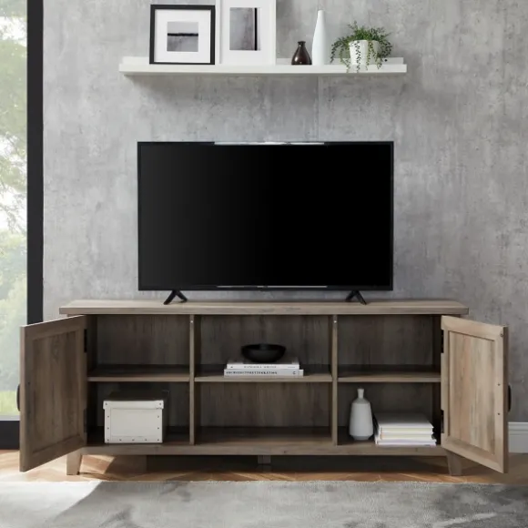 This Gray Wash Grooved Door Tv Stand Balances Style And Function Effortlessly, Providing Needed Organization. You’Ll Have Plenty Of Space For Movies, Games, And Cable Boxes. Its Light Wood Finish Is Sure To Enrich Your Space!Stand Measures 58L X 16W X 24H In. Crafted Of Warp-Resistant Wood Composite, Durable Laminate, And Metal Gray Wash Wood Finish Features One (1) Fixed Shelf And Two (2) Doors For Storage Slatted Door Front Design Antique Black Metal Handle Hardware Fits Tv Sizes Up To 65 In.Full Assembly Required Not Intended For Commercial Use Care: Dust With A Soft, Dry Cloth.This Item Is Available At Kirklands.Com Only, Not Available In Stores. Please Note: This Item Cannot Be Shipped To Apo/Fpo Addresses.