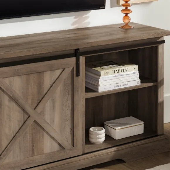 Slide Open Your New Barn Doors And Showcase Your Best Media Components With This Charming Gray Wash Sliding Barn Door Tv…