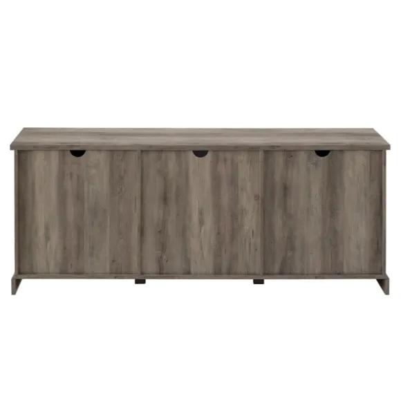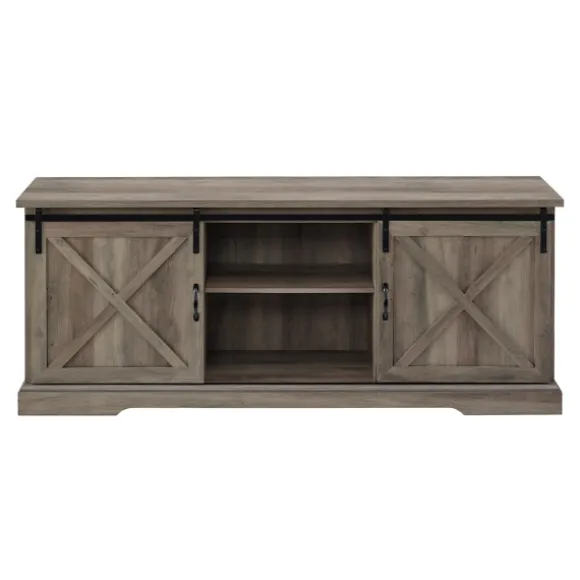 Slide Open Your New Barn Doors And Showcase Your Best Media Components With This Charming Gray Wash Sliding Barn Door Tv Stand! This Chic Rustic Console Hosts Three Adjustable Shelves, Perfect To For Holding All Your Favorite Video Games, Movies, Or Home Decor. Smooth, Powder-Coated Steel Adds A Seamless Glide To The Darling Barn Door Design. Dress It Up For A Classy Chateau Atmosphere Or Keep It Simple To Emulate A Pastoral Cottage Aura. And With Cord Management Ports For Your Electronic Cables, The Media Stand Stays Oh-So Tidy! Use This Versatile Piece In Your Living Room, Dorm, Bedroom, Or Home Office.Stand Measures 70L X 15.75W X 28H In.Crafted Of Warp-Resistant Wood Composite, Durable Laminate, And Powder-Coated Steelgray Wash Finishfeatures Two (2) Open Shelves And Two (2) Sliding Barn Doors For Storage And Cord Managementblack Metal Hardwaresliding Doors Reveal One (1) Large Middle Section And Two (2) Small Side Sections Each With Adjustable Shelvescan Support A 85-Inch Tvweight: 104 Lbs.Full Assembly Requirednot Intended For Commercial Usecare: Wipe Clean With A Damp Cloth. This Item Is Available At Kirklands.Com Only, Not Available In Stores. Please Note: This Item Cannot Be Shipped To Apo/Fpo Addresses.Warning:This Product Can Expose You To Chemicals Including Dust And Phthalates Which Is Known To The State Of California To Cause Cancer And Birth Defects Or Other Reproductive Harm.For More Information Go Towww.P65Warnings.Ca.Gov .
