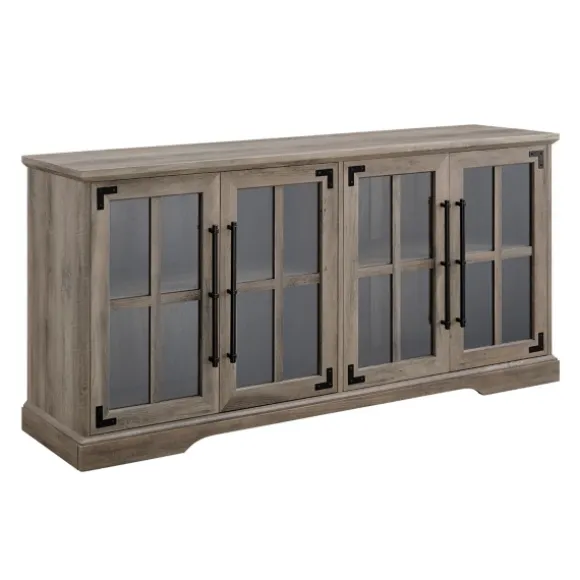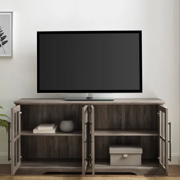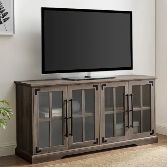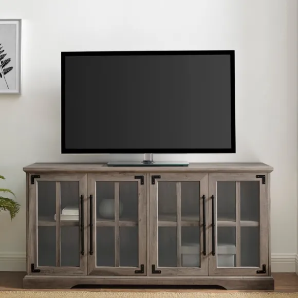 You’Ll Love The Farmhouse Windowpaned Glass Doors Of Our Gray Wash Window 4-Door Tv Stand. The Beautiful Mixture Of Wood…