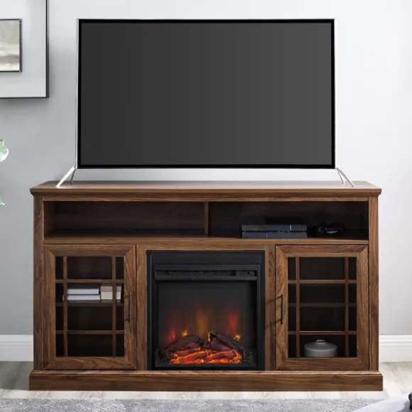 Take Your Entertainment Center To The Next Level With This Brown Wood 2-Door Led Fireplace Cabinet. Its Realistic Fire Will Give Your Living Room Or Den A Cozy Ambiance. Plus, It Has Ample Storage For All Your Media Needs! Cabinet Measures 58L X 15.75W X 33H In.Crafted Of Warp-Resistant Wood Compositebrown Finishfeatures Two (2) Open Shelves And Four (4) Interior Shelvesalso Features Two (2) Glass Paneled Doors Window Pane Door Designsoft-Close Hingesincludes A 18 In. Led Fireplace With Universal Plugfeatures A Cord Management Holeaccommodate Most Flat-Panel Tvs Up To 85 Inweight Capacity: 150 Lbs.Full Assembly Requirednot Intended For Commercial Usecare: Dust With A Soft, Dry Cloth.This Item Is Available At Kirklands.Com Only, Not Available In Stores. Please Note: This Item Cannot Be Shipped To Apo/Fpo Addresses.Warning:This Product Can Expose You To Chemicals Including Dust And Phthalates, Which Is Known To The State Of California To Cause Cancer And Birth Defects Or Other Reproductive Harm.For More Information Go Towww.P65Warnings.Ca.Gov .