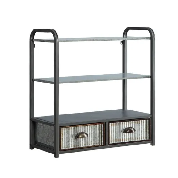 Add Functionality And Style To Any Wall With This Metal With 2-Drawers Rustic Wall Cabinet. It Is Perfect For Storing And Displaying Your Decorative Accessories With Some Farmhouse Charm.Shelf Measures 24.5L X 12W X 30H In. Crafted Of Metal Dark Metal Frame Finish Corrugated Rustic Drawer Finish Galvanized Finish On Top Two Shelves Features Three (3) Shelves And Two (2) Drawers Weight: 16 Lbs. Assembly Required Comes Ready For Wall Mount; No Additional Hanging Hardware Required Care: Dust With A Soft, Dry Cloth.This Item Is Available At Kirklands.Com Only, Not Available In Stores. Please Note: This Item Cannot Be Shipped To Apo/Fpo Addresses.