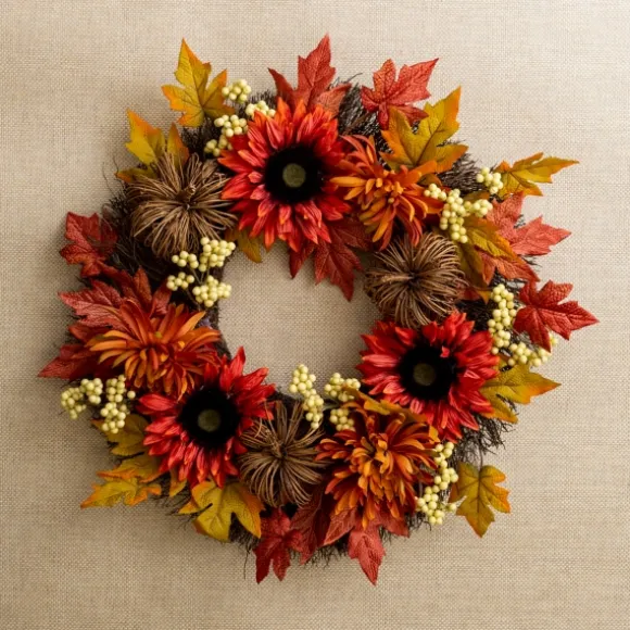 Get Your Front Door Prepared For The Harvest Season In Style! Our Sunflower And Pumpkin Rattan Wreath Is The Perfect Piece To Help You Decorate For The Crisp, Fall Days Ahead. Wreath Measures 24 In. In Diametercrafted Of Artificial Materialsartificial Mix Of Sunflowers And Pumpkinshues Of Orange, Red, White, Brown, And Greensafe For Covered Outdoor Usecomes Ready For Wall Mount; No Additional Hanging Hardware Requiredcare: Dust With A Soft, Dry Cloth.Contact Your Local Kirkland’S Store For Availability. Quantities And Selection May Vary By Location.